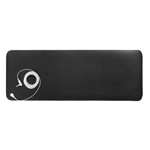 Grounding Bord/Gulvmåtte er en groundingmåtte, der hjælper dig med at opretholde jordforbindelsen, mens du arbejder eller læser. Måtten kan enten bruges på skrivebordet eller under fødderne, når du sidder og arbejder, og det anbefales at bruge den 20 minutter dagligt. Måtten har en behagelig læderoverflade, en skridsikker underside og indeholder ledende kulmateriale, der sikrer jordforbindelse. Groundingmåtten tilsluttes nemt til en stikkontakt med den medfølgende ledning.